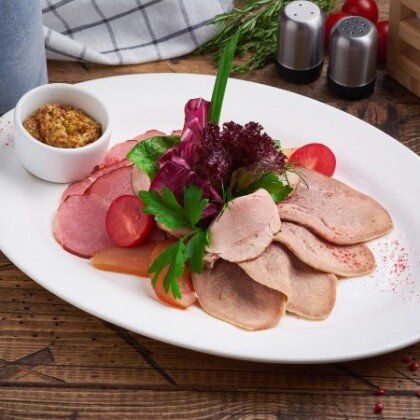 Язычок говяжий, хрен, листья салата, помидоры черри, свежая зелень, паприка 90/30/20 гр
