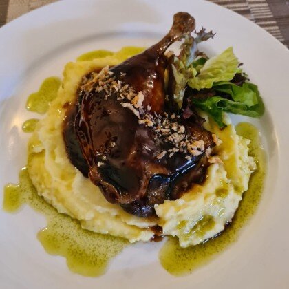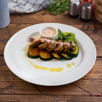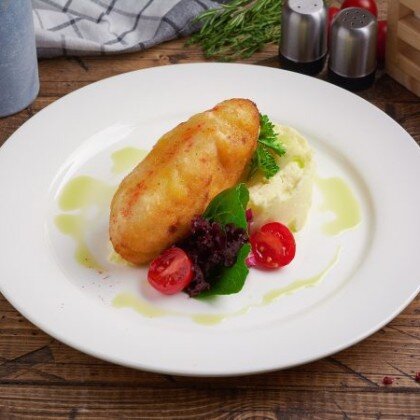 Говядина ломтиками, сол. огур., шампиньоны, сливочный соус, картофельное пюре 200/100/35 гр